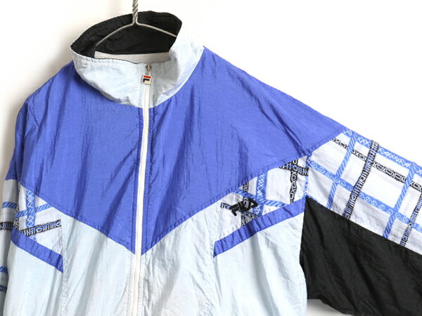 90's 大きいサイズ XL 程■ FILA フィラ フルジップ 総柄 切替 ナイロン ジャケット ( メンズ 男性 46 ) 古着 ジャンパー ライナー付き 青| 中古 90年代 ナイロンジャケット ブルゾン ブルー ライトブルー ビッグシルエット ハイネック アウター ウインドブレーカー